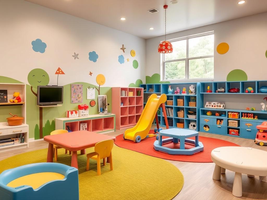 Малышам важна безопасность и сенсорика: мягкие модули, зеркала, тактильные панели, небольшие горки и коврики. Простая музыка и световые эффекты могут добавить стимулов, но без чрезмерной нагрузки на нервную систему.