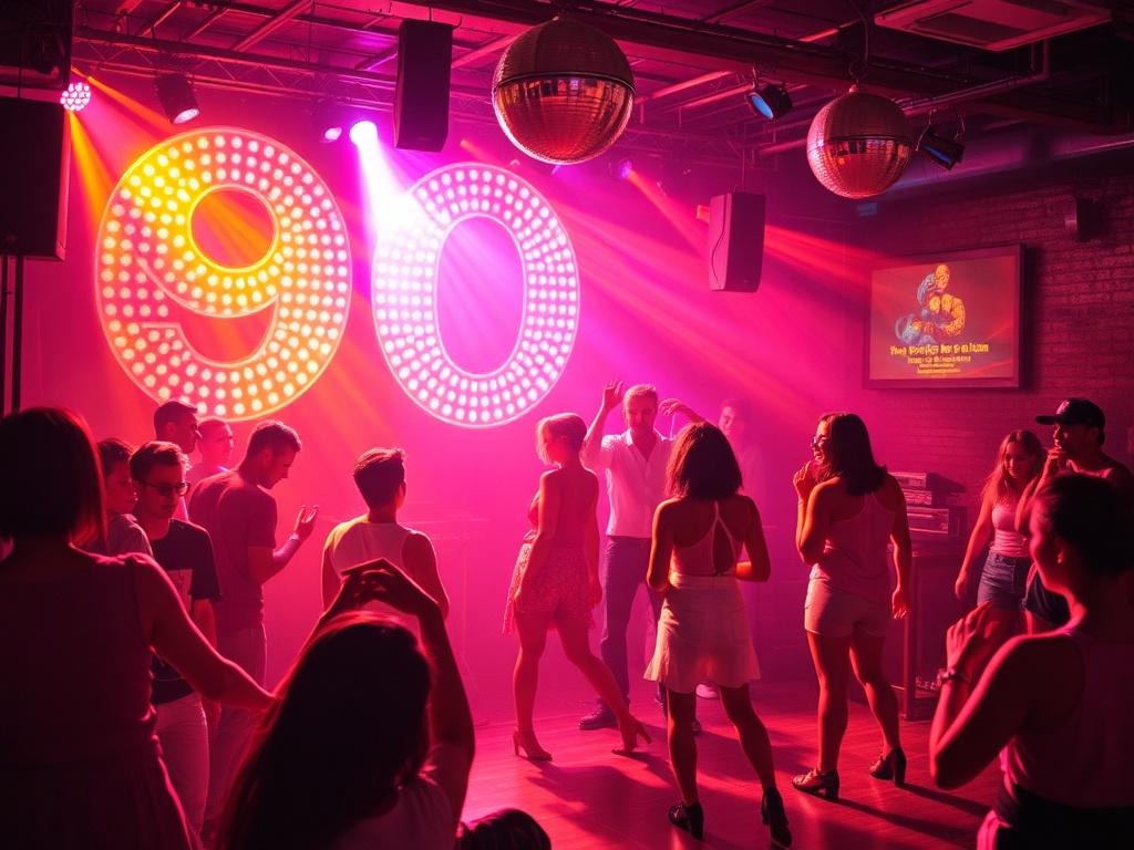 Освещение и декор — половина успеха. Зеркальные шары, лазерные лучи, прожекторы с мягким цветом, дымовые эффекты создают ощущение, что вы перенеслись назад во времени. В 90-е акцент делался на динамике света и простых визуальных решениях, а не на сложных инсталляциях.